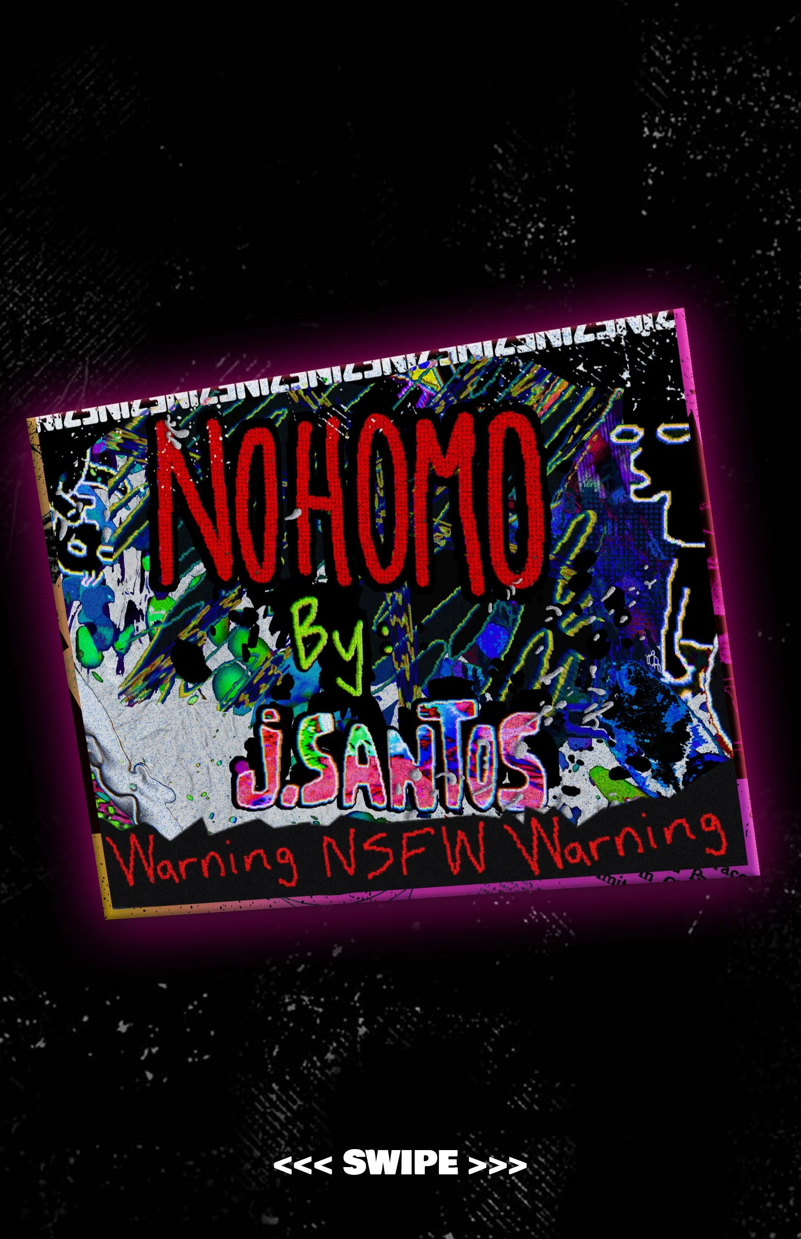Abstract artwork with bold text 'NOHOMO' by J. Santos, featuring vibrant colors and the warning 'NSFW'. The image has a dark background with a neon pink border.